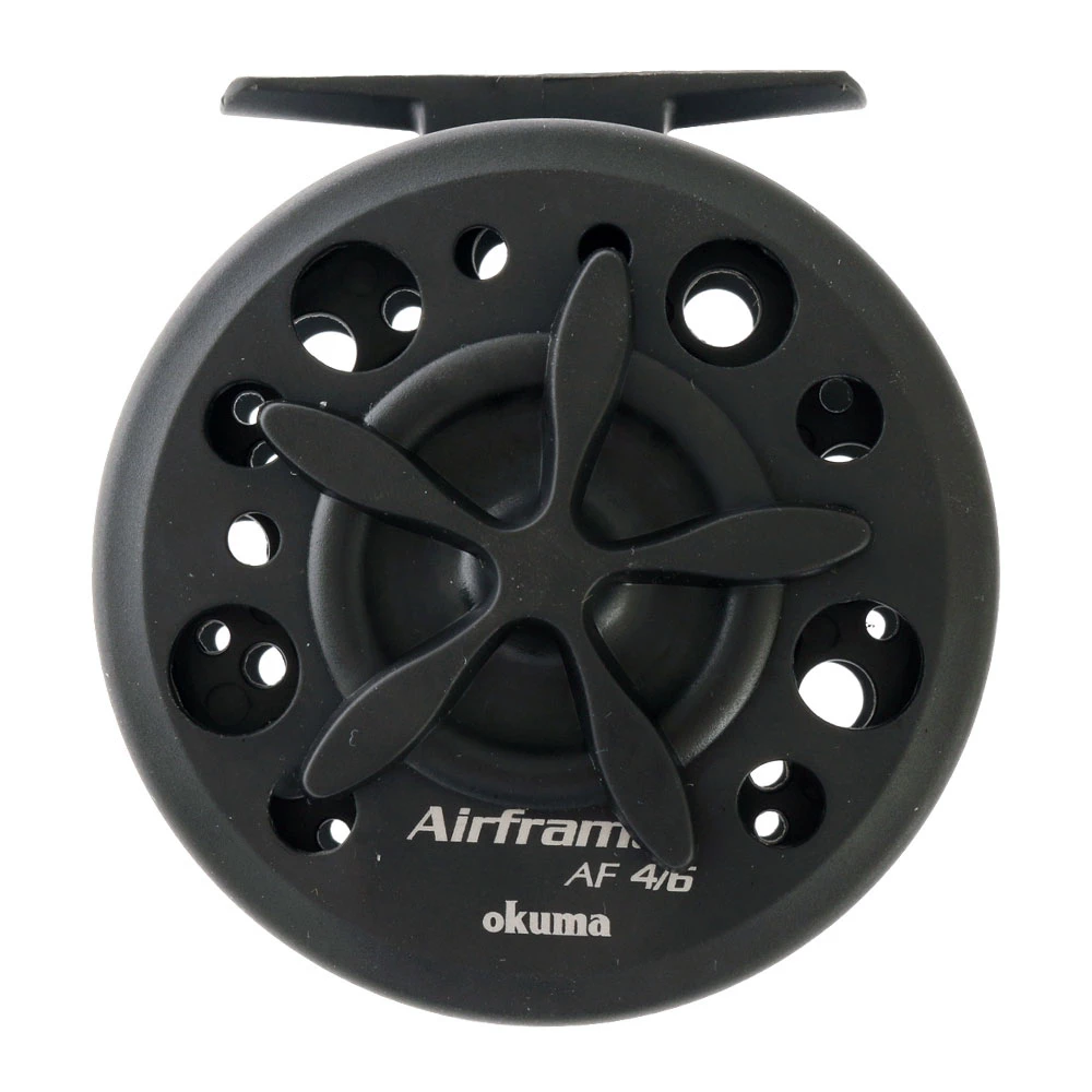 The Okuma Airframe 4/6 Graphite Fly Reel is designed to keep pace with the fast species in water with super large arbor spool design for blazing fast line retrieval. This reel features super lightweight graphite frame, precision machined stainless steel spool shaft, one-way roller bearing and multi-disc cork and stainless steel drag system.
